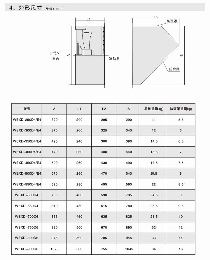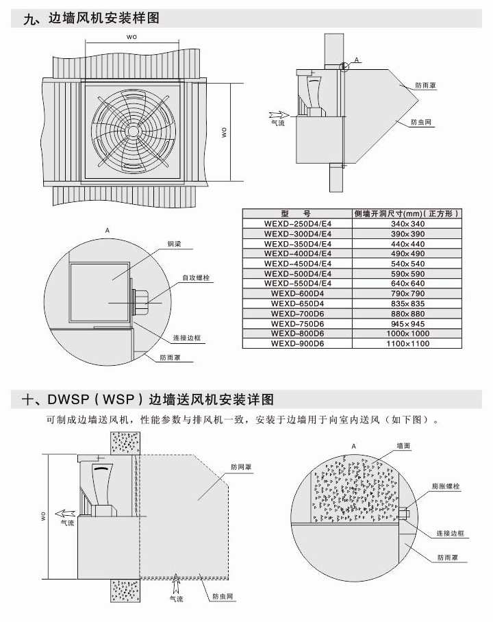 WSP不锈钢边墙送风机一般用于边墙壁式排风,配设45°防雨罩(或特殊制造成60°)和防虫网(夜间可防止昆虫循灯光飞入车间)。可按需要制成边墙送风机型号为DWSP(WSP),配设90°防雨罩(防风、雨、尘)和防虫网(夜间可防止昆虫循灯光飞入车间)。